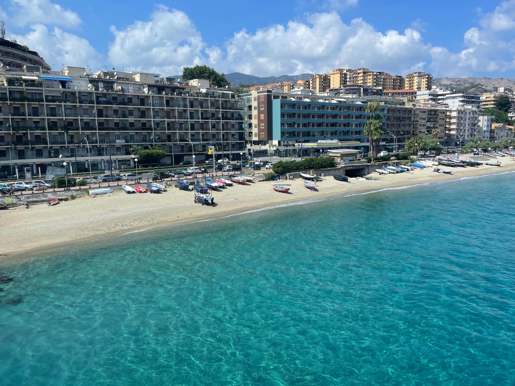 Foto della spiaggia di Messina vista dal traghetto che attraversa lo Stretto.