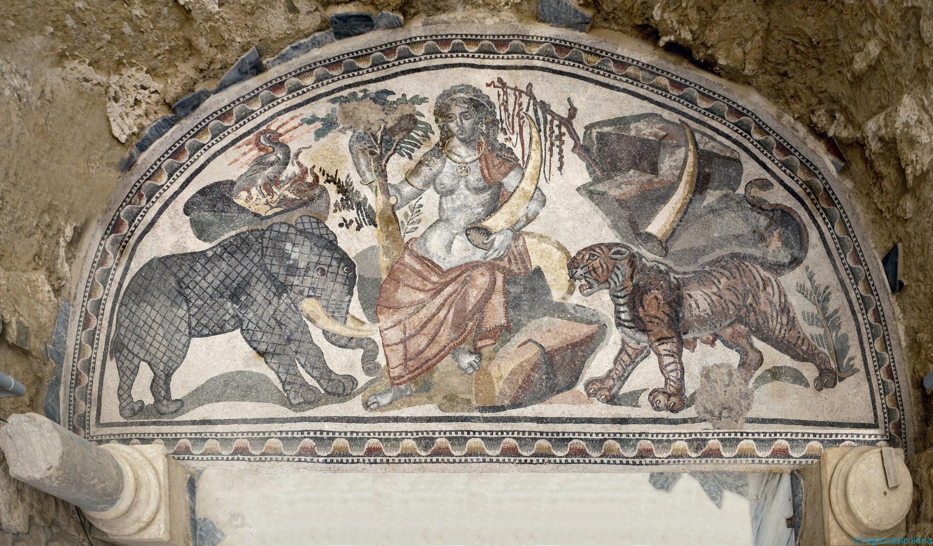 Non è solo un mosaico, è un documentario geografico dell’epoca. Lungo 60 metri, raffigura la cattura (non l’uccisione) di belve feroci in Africa e India.