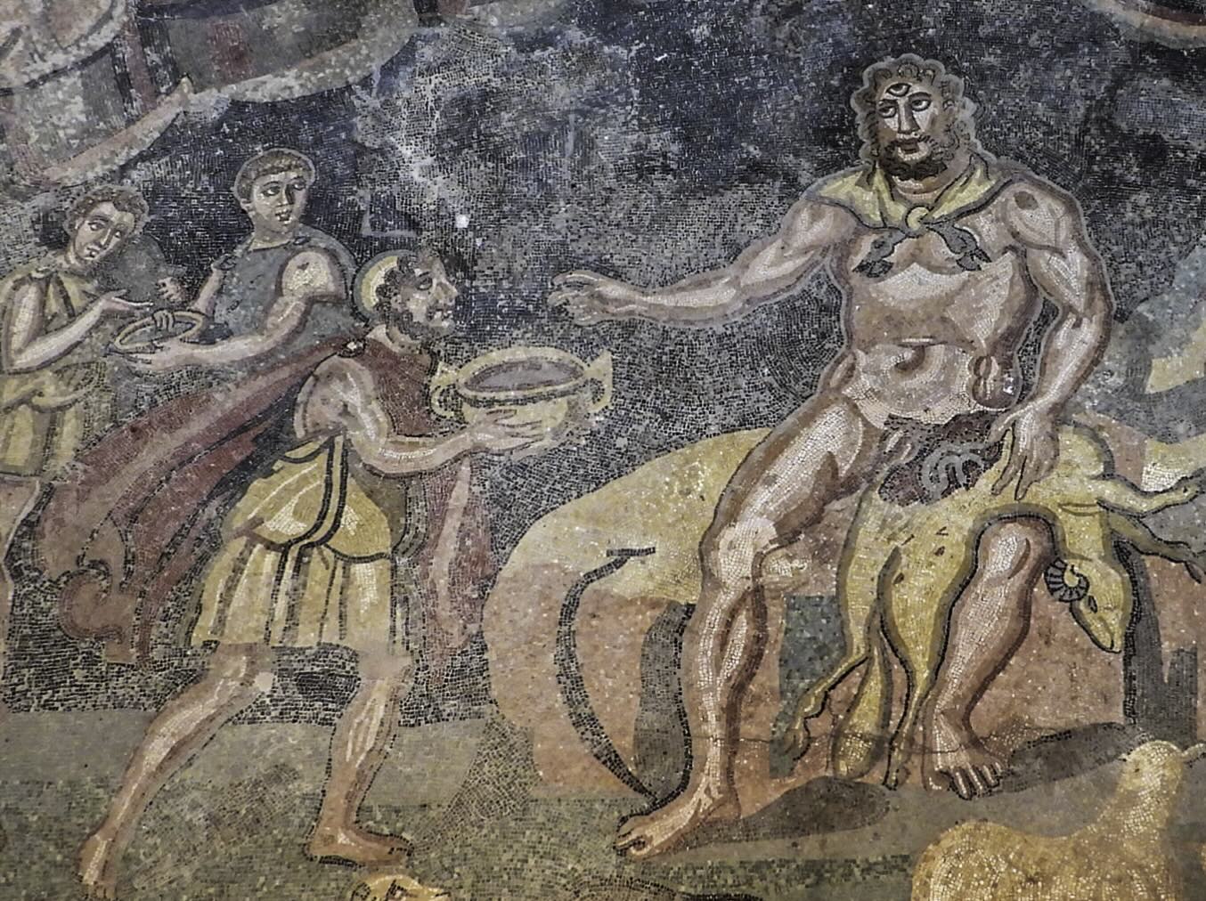 Spesso ignorato perché tutti corrono verso la caccia, questo mosaico mostra Ulisse che offre vino al ciclope Polifemo.